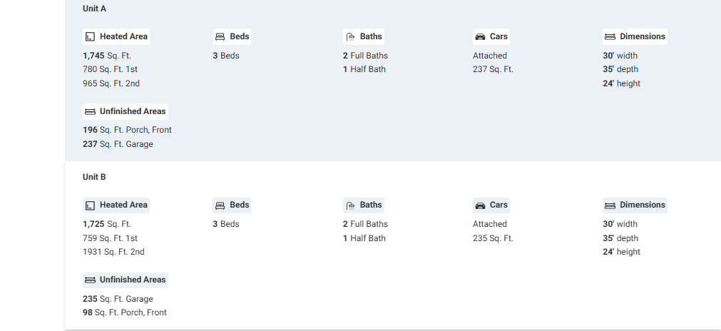 - This contemporary modern duplex house plan gives you two units each with 3 bed, 2.5 bath and 1 car garage.